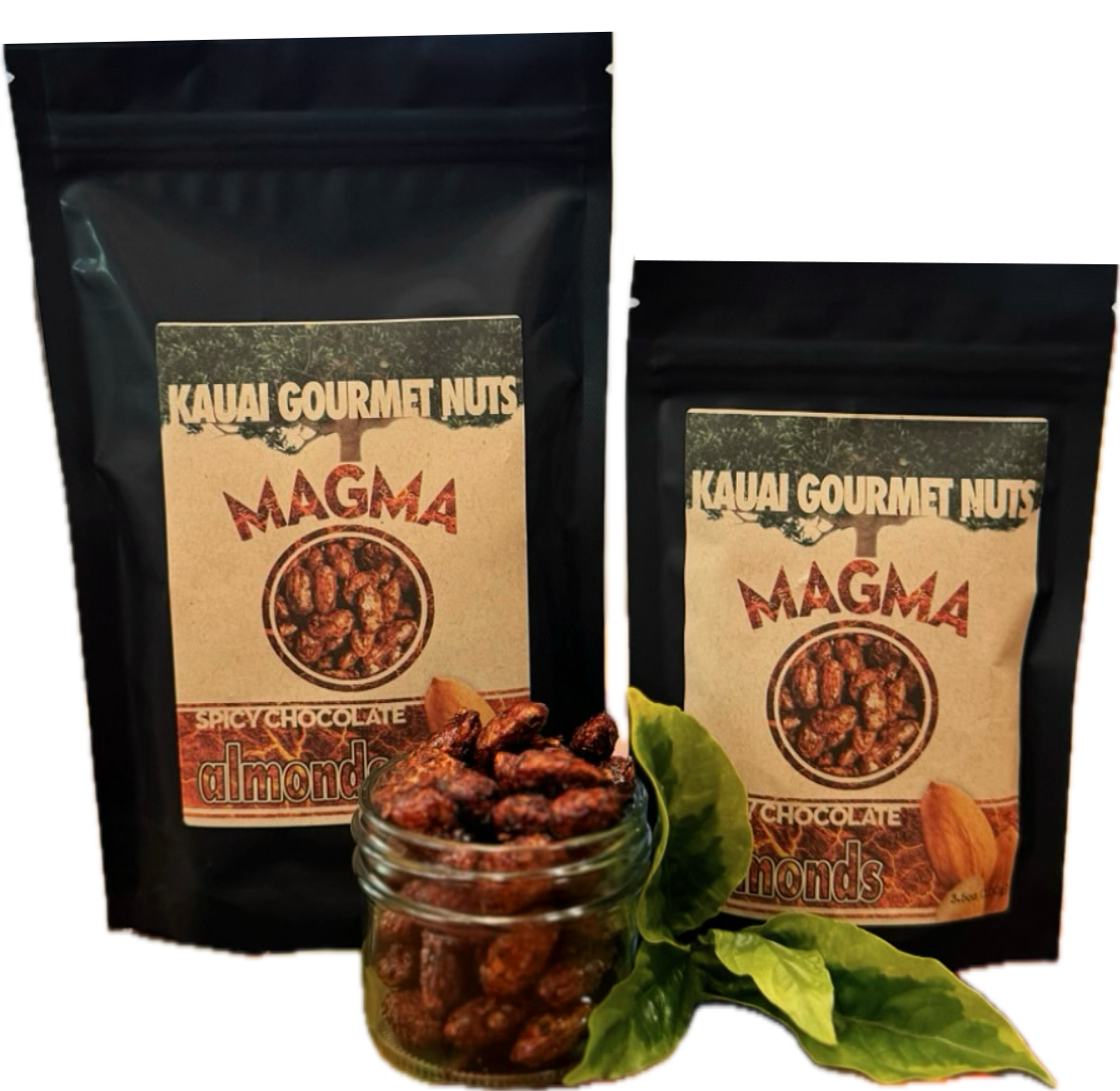 We vacation on Kauai on a regular basis and will always stop in at Kauai Gourmet Nuts and pick up a bag or 2. I love hot & spicy and this year I tried the Magma Spicy Almonds. The free sample I received was outstanding, so I purchased a bag of the almonds. Bad move! The almonds are so good, chocolate with a nice amount of heat, that they disappeared within a few days of arriving home! So, it was cheaper, but not as much fun, ordering more bags of the almonds online! They arrived and once again started to disappear! Will be back to Kauai in 10 months, so will stock up then but continue to order online until our return!