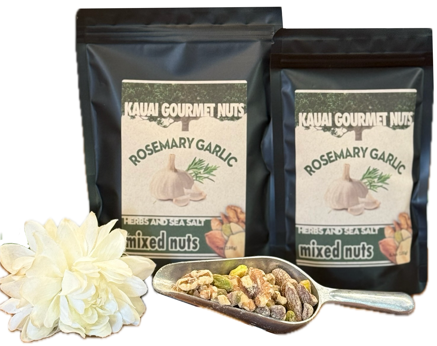Kaua'i macadamias, walnuts, pistachios, and dry roasted almonds with a generous seasoning of rosemary, garlic, sea salt and black pepper.