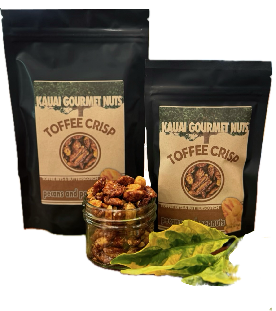 Two packages of Kauai Gourmet Nuts Toffee Crisp Pecans and Peanuts with a jar of nuts and leaves on a white background.
